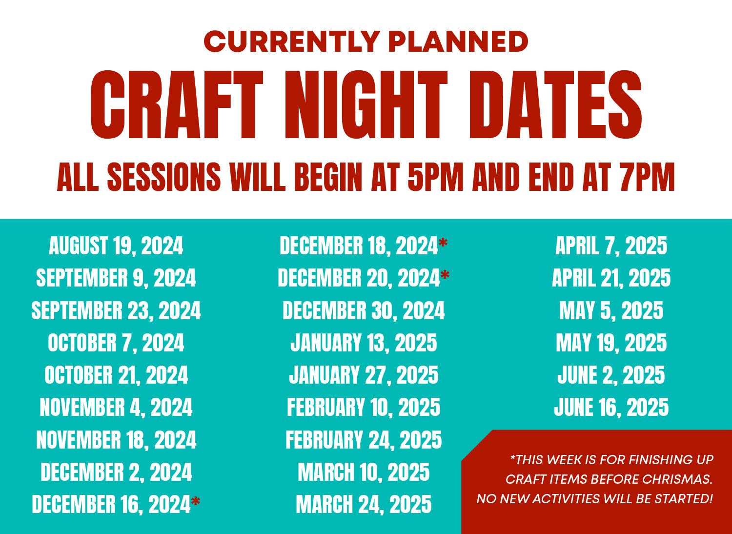Light snacks will be provided. There will also be hot irons and sharp objects in use during some of the classes, so if you bring your children there will be FREE childcare available for up to the age of 7 yrs. old. There will be safe crafts that are age appropriate. All minors attending the craft nights must be accompanied by an adult.